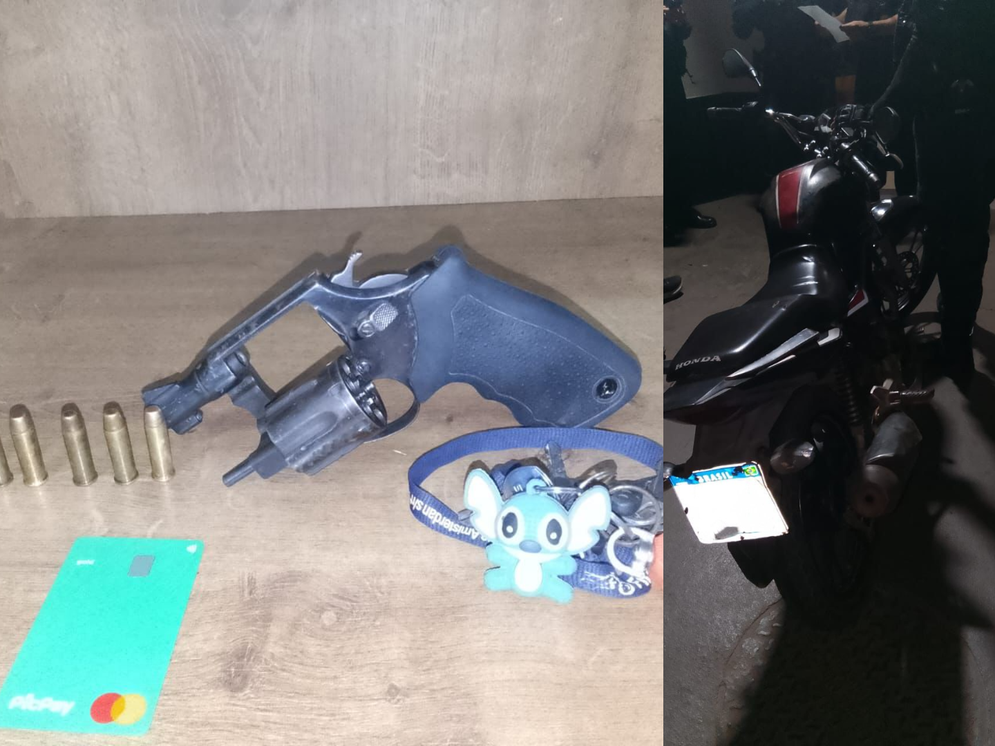 Sendo assim, nesta ação, os policiais apreenderam um revólver calibre .38 com seis munições intactas. Além disso, recolheram a motocicleta CG Titan preta, um aparelho celular Xiaomi 13C, um cartão PicPay e, por fim, outros pertences que seriam de vítimas de roubo.