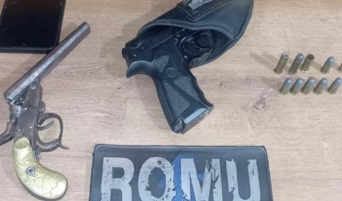 No interior do imóvel, os guardas encontraram uma pistola de pressão marca Rossi, modelo C12 Pistol, calibre 4,5mm metal BB, com coldre preto da marca Cia Militar, além disso, localizaram uma arma de fogo tipo garrucha, sem marca ou numeração aparente, municiada com duas munições intactas calibre .38.
