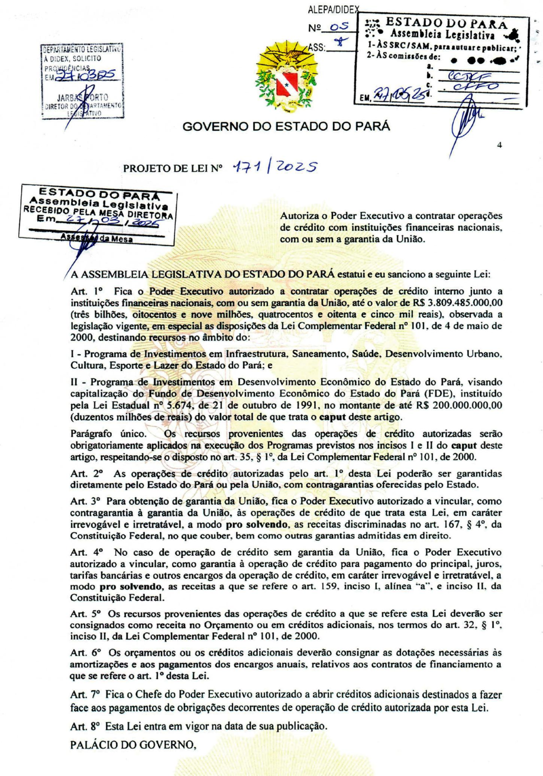 A lei sancionada pela Assembleia Legislativa do Estado do Pará autoriza o Poder Executivo a contratar operações de crédito no valor de R$ 3,8 bilhões com instituições financeiras nacionais, podendo contar com garantia da União.