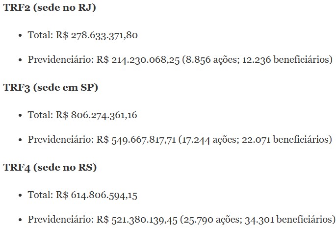 O total liberado pelo CJF alcança R$ 3,7 bilhões, abrangendo, portanto, 292.586 pessoas que venceram, no total, 233.911 ações judiciais contra órgãos da União. As RPVs são indenizações pagas após decisões dos Juizados Especiais Federais, cujas causas não ultrapassam 60 salários mínimos (atualmente, R$ 91.080).