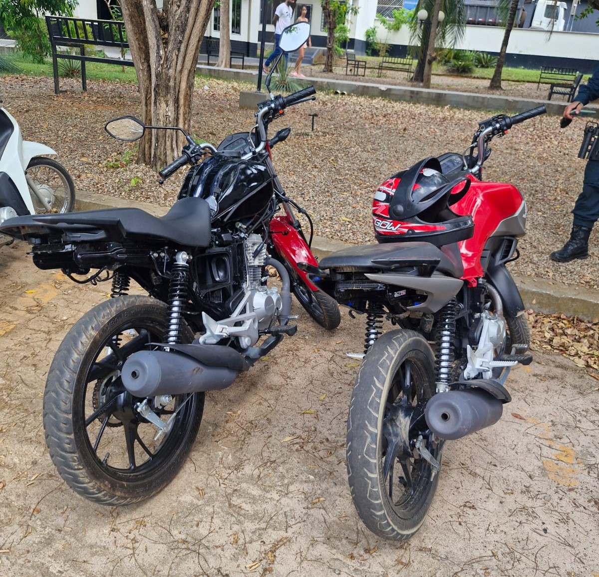 Em seguida, a guarnição se dirigiu ao local indicado, um lote vazio próximo à residência de Mateus, e localizou a motocicleta, que possuía carenagens com registro de furto/roubo de placa. Questionados sobre o paradeiro de Lucas, ambos informaram não saber, afirmando que só se encontraram com ele durante as manobras de “grau”.