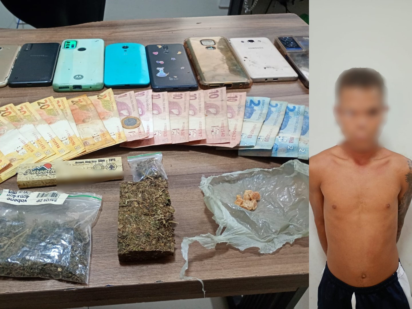 Os policiais conseguiram alcançá-lo e, diante da resistência, utilizaram força progressiva para contê-lo, conforme prevê a legislação vigente. Em seguida, durante a busca domiciliar, a polícia encontrou 71,8 gramas de maconha acondicionadas em sacos plásticos tipo “zip”, R$ 291,00 em dinheiro e oito aparelhos celulares de procedência não comprovada.