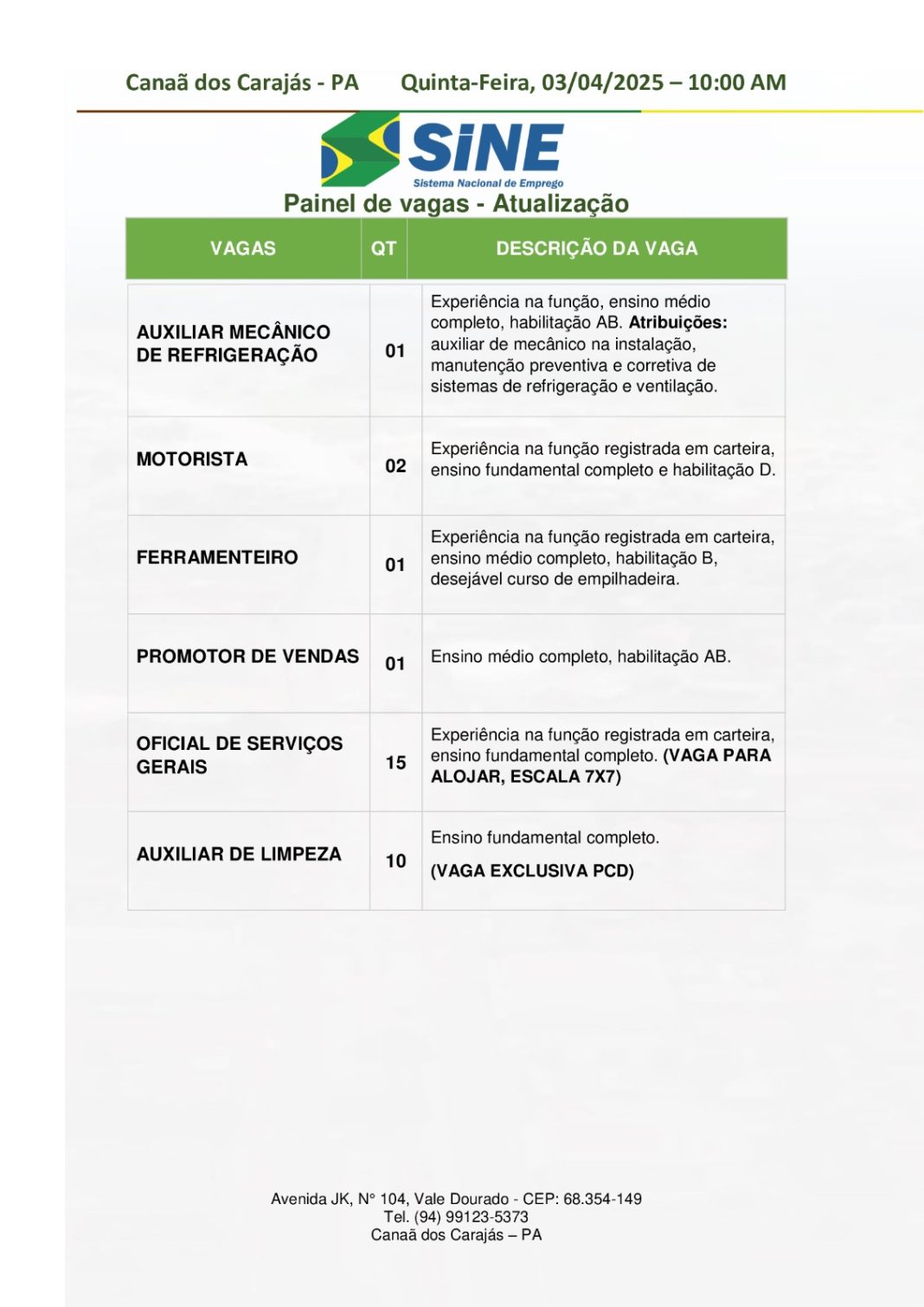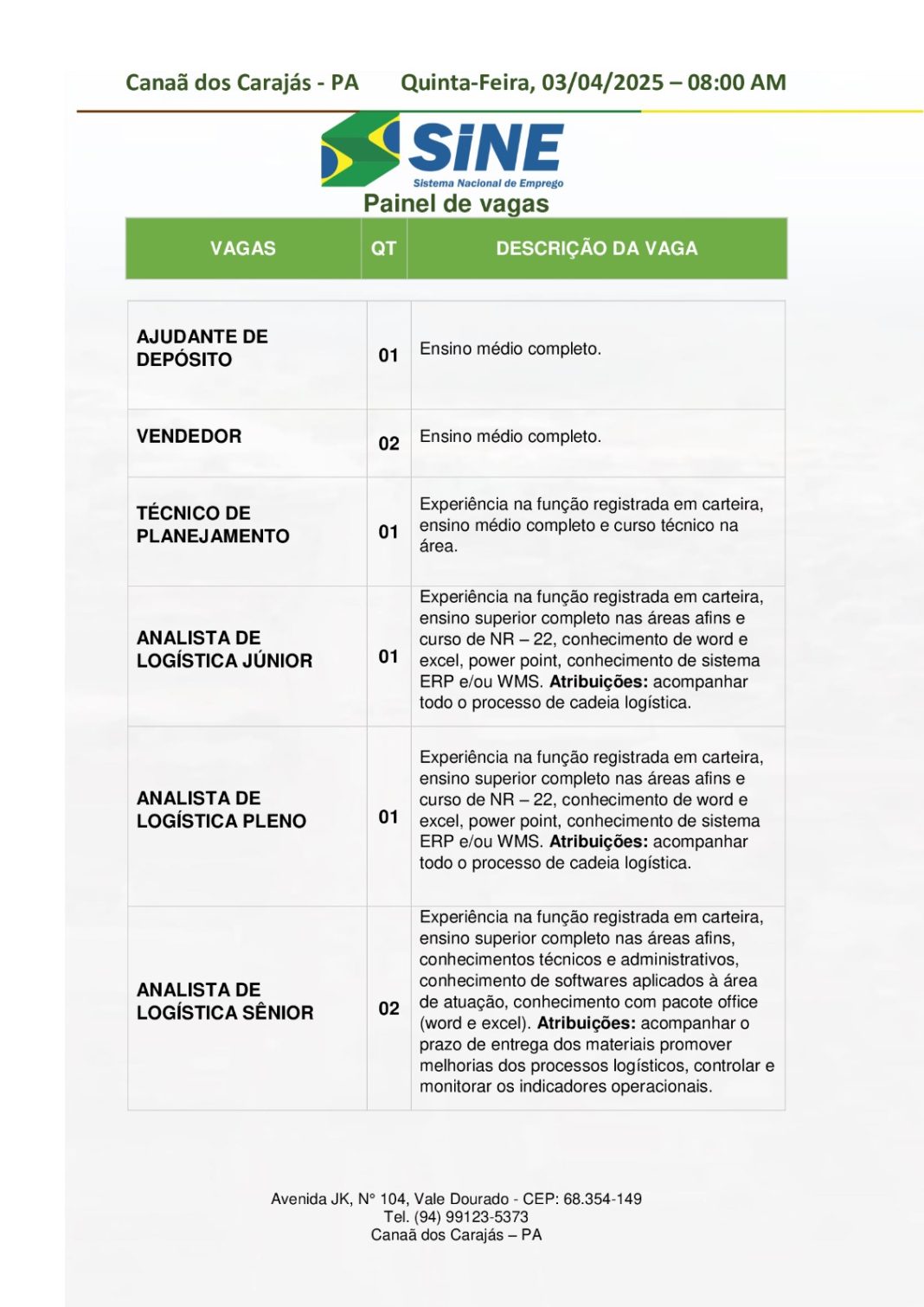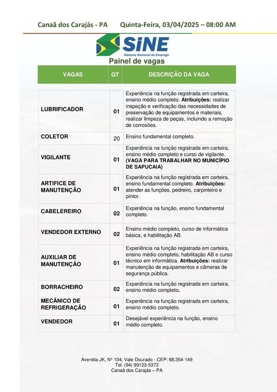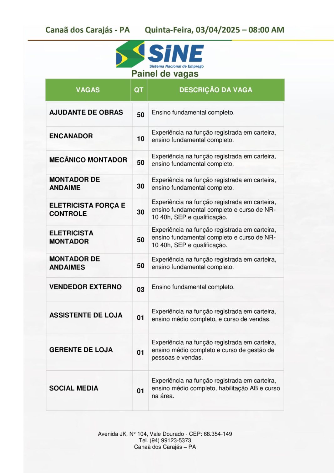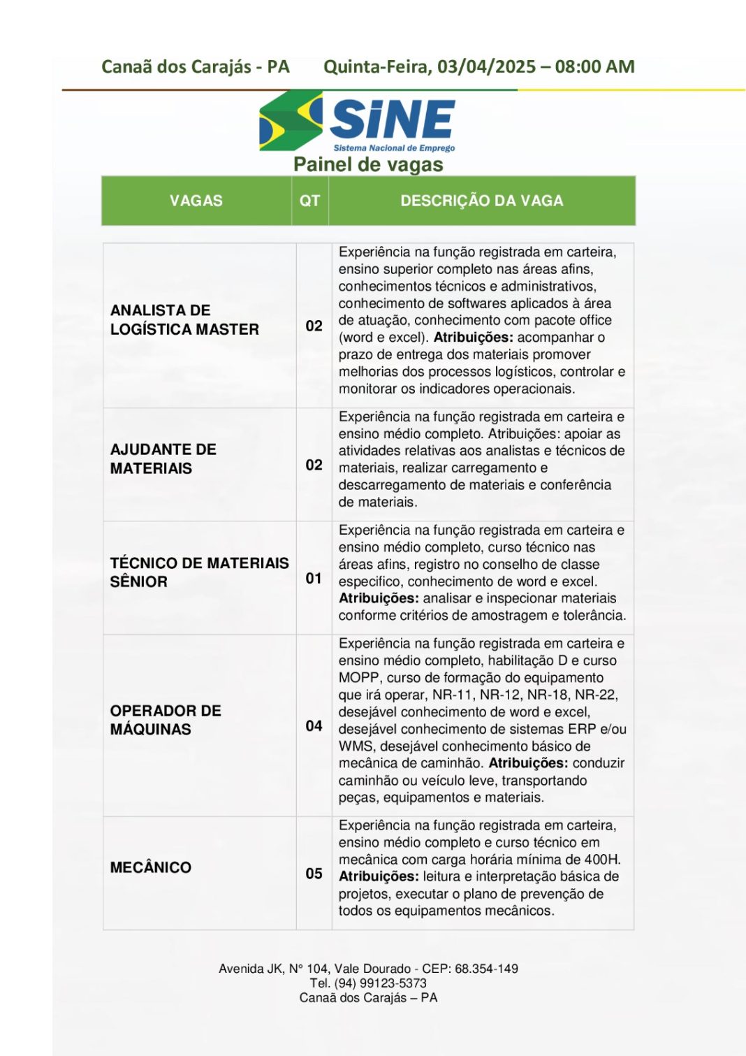 Os interessados devem comparecer ao Sine de Canaã dos Carajás, localizado na Avenida JK, Nº 104, bairro Vale Dourado, munidos de: